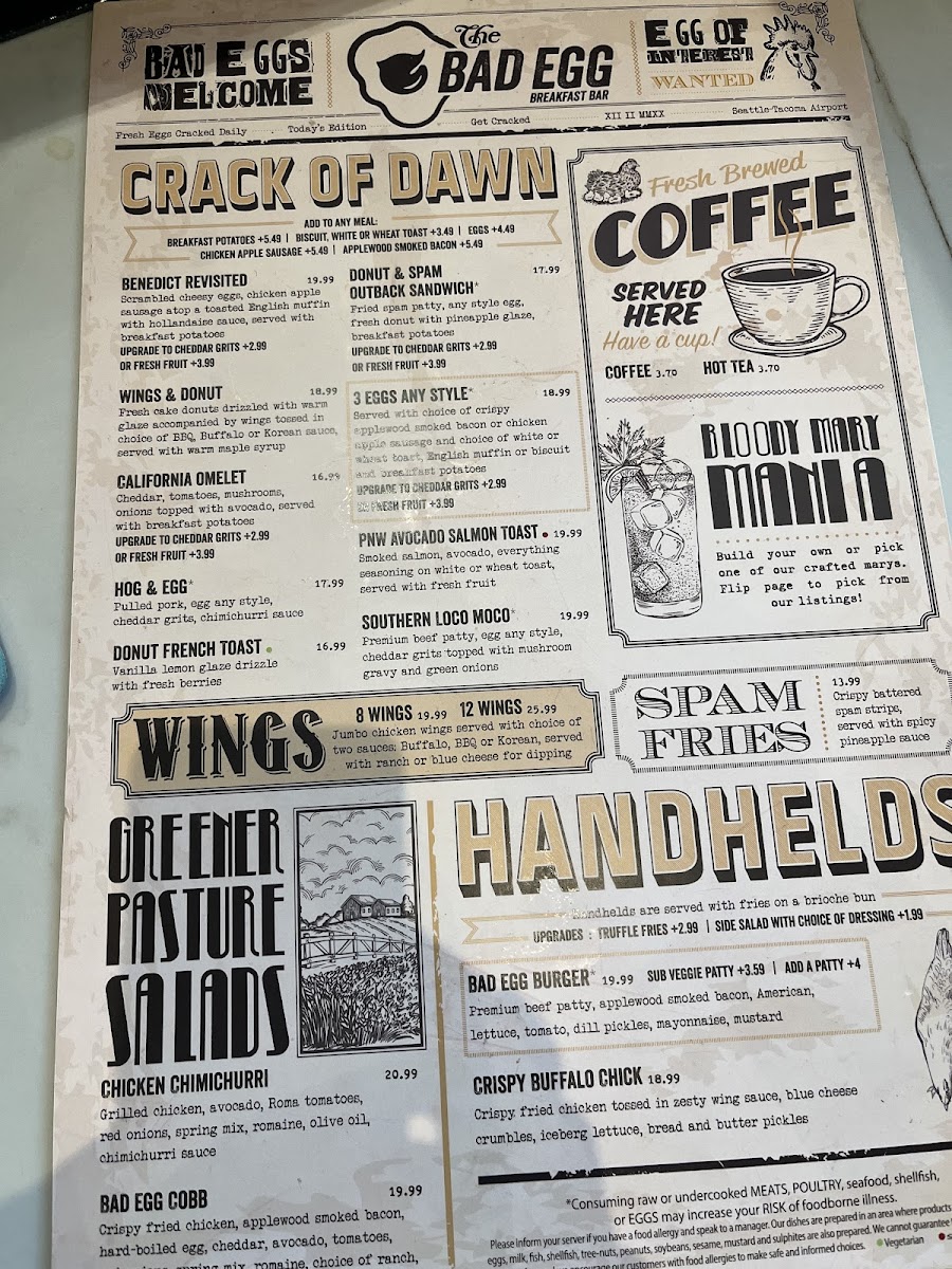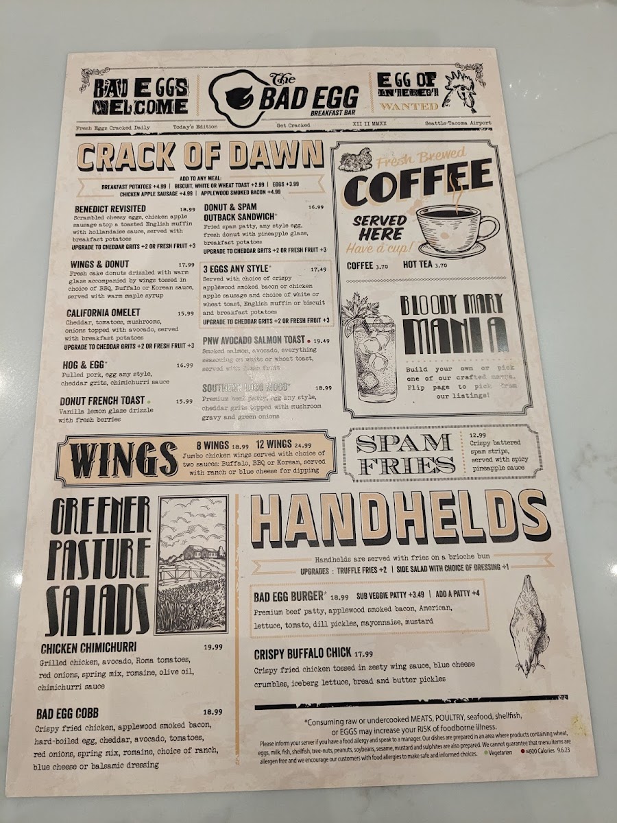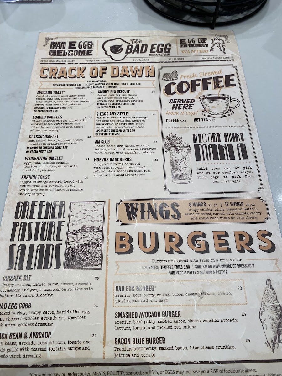 Bad Egg Breakfast Bar offers a straightforward yet inviting menu centered around comforting breakfast and brunch favorites with a casual, approachable vibe. Here, you’ll find hearty dishes designed to satisfy early travelers, busy airport guests, or anyone looking for a familiar morning meal with a bit of flair.