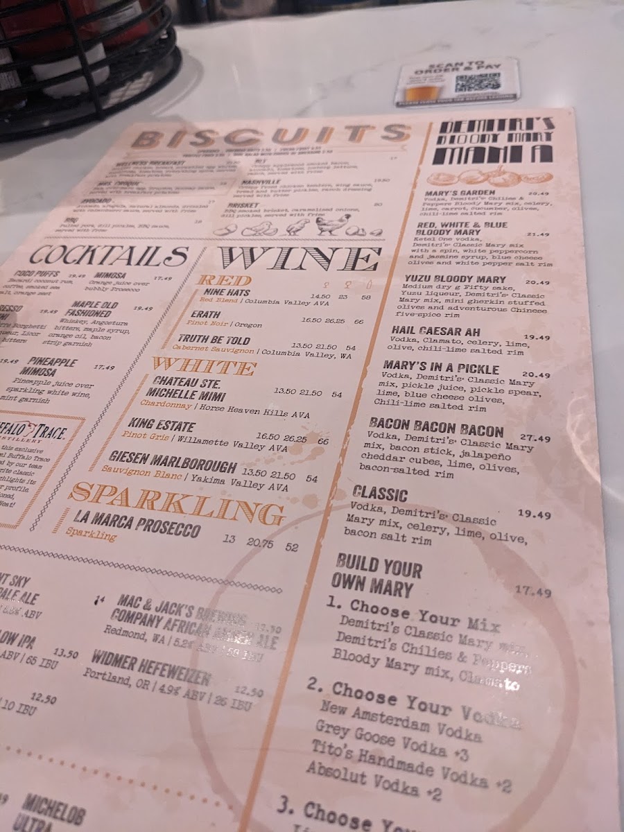 The menu strikes a balance between classic breakfast staples and creative twists, including items like Eggs Benedict, Loco Moco, and the Brisket Biscuit. Whether it’s a savory bite like the Breakfast Burger or Nashville Hot Chicken Biscuit, or a sweet treat such as Donut French Toast, the offerings suit a variety of appetites and preferences. Freshly brewed coffee and thoughtfully mixed drinks like Mimosas and Classic Bloody Marys add to the relaxed yet lively atmosphere.